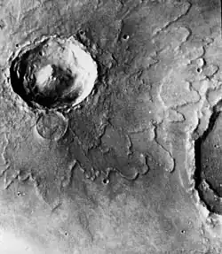 ![]() Imagem da cratera Yuti obtida em 1977 pelo orbitador Viking 1. | |