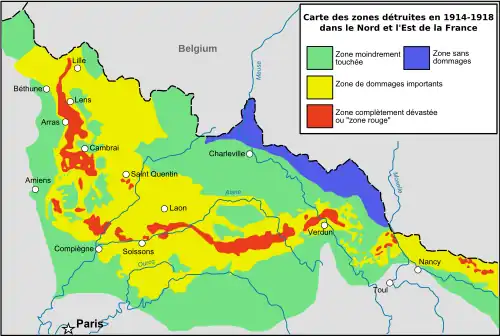 Sob a lei francesa, atividades como habitação, agricultura ou silvicultura foram temporariamente ou permanentemente proibidas na Zona Rouge, por causa da grande quantidade de restos humanos e animais, e milhões de itens de munições não detonadas contaminando a terra. Algumas cidades e aldeias nunca foram autorizadas a serem reconstruídas após a guerra.[1][2][3]