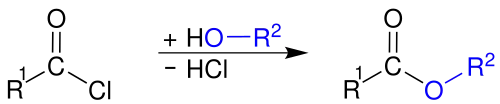 A reação entre cloretos de ácido e álcoois, forma ésteres. Esta reação libera bastante calor e deve ser realizada com cautela; além disso os cloretos de ácido são reagentes corrosivos e suscetíveis à hidrólise. A reação genérica está mostrada a seguir.