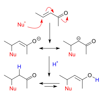 Adição conjugada nucleofílica é um tipo de reação orgânica. Adições nucleofílicas ordinárias ou adições 1,2-nucleofílicas lidam principalmente com adições a compostos de carbonila. Compostos alquenos simples não mostram reatividade 1,2 devido à falta de polaridade, salvo se o alqueno é ativado com substituintes especiais. Com compostos de carbonila α,β-insaturados tais como cicloexenona, pode ser deduzida das estruturas de ressonância que a posição β é um sítio eletrofílico, o qual pode reagir com um nucleófilo. A carga negativa nestas estruturas é armazenada em um ânion alcóxido. Uma adição nucleofílica é chamada de adição conjugada nucleofílica ou adição 1,4-nucleofílica. Os alquenos ativados mais importantes são as acima mencionadas carbonilas e acrilonitrilas conjugadas.