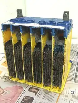 A bateria é formada por várias pilhas em série ou paralelas.[3][4][5]