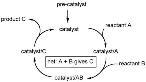 O ciclo catalítico é o principal método para escrever o papel de catalisadores em bioquímica, química de organometálicos, ciência dos materiais, etc. Além disso, corresponde à sequência de reações pelas quais o catalisador passa, iniciando pela ativação, seguindo por etapas intermediárias e finalizando com sua regeneração, que o devolve à forma original [2].Essa regeneração permite que o catalisador realize múltiplos ciclos, caracterizando parâmetros como a frequência de turnover [3].O conceito é aplicado em diferentes modalidades de catálise — homogênea, heterogênea e enzimática — nas quais a manutenção da atividade e da integridade do catalisador é essencial.