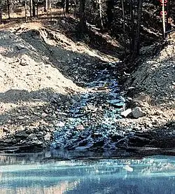 As atividades mineiras podem provocar a contaminação de rios e águas subterrâneas com cobre e outros metais, tanto durante a exploração como uma vez abandonada. O derramamento mostrado na foto provém de uma mina abandonada em Idaho. A coloração turquesa da água e rochas se deve a presença de precipitados de cobre.
