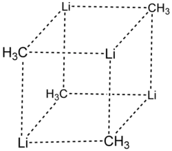 Alguns compostos organolítio como o metil-lítio e o n-butil-lítio são compostos covalentes que ocorrem como clusters tetraméricos em forma de cubo ou hexaméricos em uma forma octaédrica, com os átomos de lítio e os carbonos do grupo alquila localizados em vértices alternados do cubo ou octaedro (cada Li adjacente a três C e vice-versa), no qual o átomo de carbono do grupo orgânico está ligado aos três lítios vizinhos por uma ligação 4c-2e.