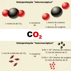 Comparação entre molécula e mol para a substância gás carbônico (CO2).