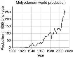 30. a b «Molybdenum Statistics and Information». U.S. Geological Survey. 10 de maio de 2007. Consultado em 10 de maio de 2007