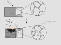 Pirólise - (do Grego pyr, pyrós = fogo + lýsis = dissolução) - Em sentido estrito é uma reação de análise ou decomposição que ocorre pela ação de altas temperaturas. Ocorre uma ruptura da estrutura molecular original de um determinado composto pela ação do calor em um ambiente com pouco ou nenhum oxigênio.