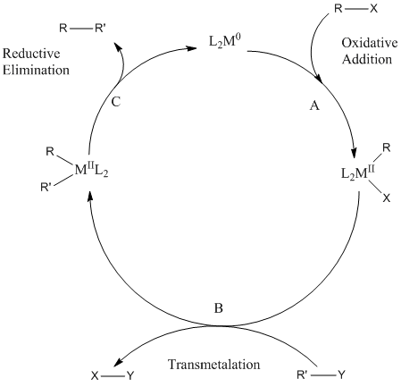 O mecanismo de reação geralmente inicia com a adição oxidativa de um haleto orgânico ao catalisador. Subsequentemente, o segundo parceiro sofre transmetalação, o que coloca ambos os parceiros de acoplamento no mesmo centro metálico enquanto eliminando os grupos funcionais. A etapa final é a eliminação redutiva dos dois fragmentos de acoplamento para regenerar o catalisador e produzir o produto orgânico. Grupos orgânicos insaturados acoplam-se mais facilmente em parte porque eles adicionam-se prontamente. O intermediário também são menos propensos a eliminação de hidreto beta.[5]