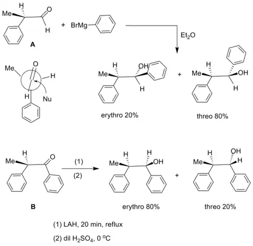 As reações de adições foram estudadas com uma variedade de nucleófilos, neste tópico será utilizado dados de adição por hidreto e compostos organometálicos, no qual, inicialmente foram analisados por D. J. Cram e seus colaboradores no qual desenvolveu uma relação empírica denominada Regra de Cram (Cram's rule).[12]