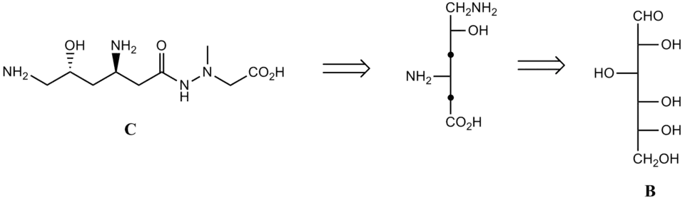 Retro síntese da negamicina (C) a partir de glicose (B).