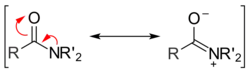 Outro fator que desempenha um papel na determinação da reatividade dos compostos acila é a ressonância. As amidas exibem duas formas principais de ressonância. Ambos são os principais contribuintes para a estrutura geral, tanto que a ligação amida entre o carbono carbonil e o nitrogênio amida tem um caráter significativo de ligação dupla. A barreira de energia para rotação em torno de uma ligação amida é de 75 a 85 kJ / mol (18 a 20 kcal / mol), muito maior que os valores observados para ligações simples normais. Por exemplo, a ligação C-C em etano possui uma barreira energética de apenas 12 kJ / mol (3 kcal / mol).[2] Uma vez que um nucleófilo ataca e um intermediário tetraédrico é formado, o efeito de ressonância energeticamente favorável é perdido. Isso ajuda a explicar por que as amidas são um dos derivados acil menos reativos.