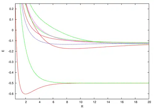 Assintoticamente, os eigenenergies (total) para estes dois menores estados mentirosos têm a mesma expansão assintótica poderes inverso da distância inter-nuclear R (de ordem elevada por Cížek e colegas em 1986)[4][5]: