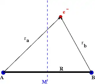 O mais simples equação de onda de Schrödinger eletrônica para o íon de hidrogênio molecular é modelado com dois fixos centros nucleares, identificado como A e B, e um elétron. Ela pode ser escrita como: