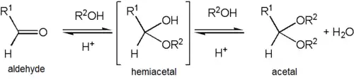 A formação de um acetal ocorre quando o grupo hidroxila de um hemiacetal torna-se protonado e é perdido como água. O carbocátion produzido é então rapidamente atacado por uma molécula de álcool. A perda do próton do álcool ligado dá origem ao acetal.