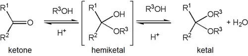 - ↑ IUPAC, Compêndio de Terminologia Química, 2ª ed. ("Gold Book"). Compilado por A. D. McNaught e A. Wilkinson. Blackwell Scientific Publications, Oxford (1997). Versão online: "ketals" (2006–) criado por M. Nic, J. Jirat, B. Kosata; atualizações compiladas por A. Jenkins. ISBN 0-9678550-9-8.