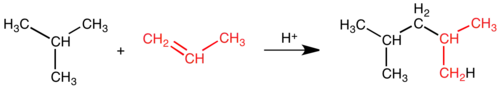 No processo de refinação do petróleo padrão, o isobutano é alquilado com alcenos de baixo peso molecular (principalmente uma mistura de propeno e buteno) na presença de um catalisador ácido de Brønsted, como o ácido sulfúrico ou o ácido fluorídrico.[3] Nas refinarias de petróleo existe uma unidade de alquilação de ácido sulfúrico ou uma unidade de alquilação de ácido fluorídrico onde se realizam as alquilações. O catalisador protona os alquenos (propeno, buteno) para produzir carbocatiãos reativos, os quais alquilam o isobutano. A reação é conduzida a temperaturas amenas (entre 0 e 30 °C) numa reação em duas fases. Como a reação é exotérmica, é necessário arrefecimento. As fábricas de alquilação de ácido sulfúrico requerem baixas temperaturas, pelo que o meio de arrefecimento deve ser refrigerado, mas nas unidades de alquilação de ácido fluorídrico é suficiente utilizar água normal como refrigerante. É importante manter uma alta proporção isobutano/alqueno no ponto de reação para impedir reações colaterais que produziriam um produto com uma octanagem mais baixa, de modo que as fábricas têm de reciclar o isobutano e adicioná-lo novamente. As fases separam-se espontaneamente, pelo que a fase ácida é misturada vigorosamente com a fase hidrocarbonada para criar uma superfície de contacto suficiente.