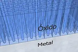 Filmes porosos de 100 µm podem ser feitos facilmente. Isto é 100 vezes a espessura do filme de “barreira de oxido” mais espesso. Ao contrário da barreira de óxido, uma alta tensão não é necessária para fazer um filme mais grosso. Isto se deve ao tipo particular de estrutura dessas camadas. O óxido tem uma estrutura celular com um poro central em cada célula. As dimensões das células e dos poros depende da composição do banho, da temperatura e da tensão, mas o resultado é sempre uma alta densidade de poros finos. O diâmetro da célula é na faixa de 50 a 300 nm e o diâmetro dos poros fica entre 0,3 e 0,5 do diâmetro da célula.