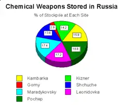 Rússia entrou na CWC com o maior estoque declarado de armas químicas.[27] Até 2010 o país tinha destruído 18 241 toneladas em instalações de destruição localizadas em Gorny (Oblast de Saratov) e Kambarka (República da Udmúrtia) onde as operações terminaram e Shchuchye (Oblast de Kurgan), Maradykovsky (Oblast de Kirov), Leonidovka (Oblast de Penza), enquanto as instalações são em construção em Pochep (Oblast de Briansk) e Kizner (República da Udmúrtia).[28]