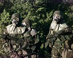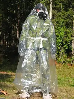 Um soldado do exército sueco vestindo uma roupa de proteção de agentes químicos (C-vätskeskydd) e uma máscara de proteção (skyddsmask 90).