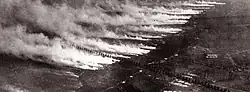 Em 22 de abril de 1915, perto de Ypres, na Bélgica, milhares de cilindros de gás clorídrico produzidos por indústrias como Bayer e Hoechst foram usados pelos alemães contra o exército francês. De efeito asfixiante, o gás provoca queimaduras nos olhos, garganta e pulmões, cegueira, náusea e dor de cabeça. Cerca de 6 mil pessoas morreram dolorosamente. Em setembro, os aliados passaram a usar o mesmo recurso contra as linhas alemãs, até que em 1917 a fórmula foi superada pelo gás mostarda, ainda mais letal. Durante toda a guerra, mais de 124 mil toneladas de 21 agentes tóxicos diferentes fizeram estimadas 1 milhão de baixas, com 90 mil mortes.[3]