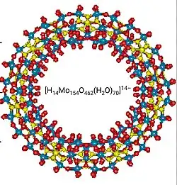 - ↑ "[Mo 154 (NO) 14 O 420 (OH) 28 (H 2 O) 70 ] (25±5)− : Uma roda grande solúvel em água com mais de 700 átomos e uma massa molecular relativa de cerca de 24000", A. Müller, E. Krickemeyer, J. Meyer, H. Bogge, F. Peters, W. Plass, E. Diemann, S. Dillinger, F. Nonnebruch, M. Randerath, C. Menke, Angew. Química Int. Ed. Engl. , 1995, 34 , 19, 2122. A primeira fórmula foi publicada com um limite de erro para a carga negativa, a fórmula final atualmente aceita é [Mo 154 (NO) 14 O 448 H 14 (H 2 O) 70 ] 28− (ver "Soluble Molybdenum Blue—'des Pudels Kern'", A. Müller, C. Serain, Acc. Chem. Res. , 2000, 33 , 2).