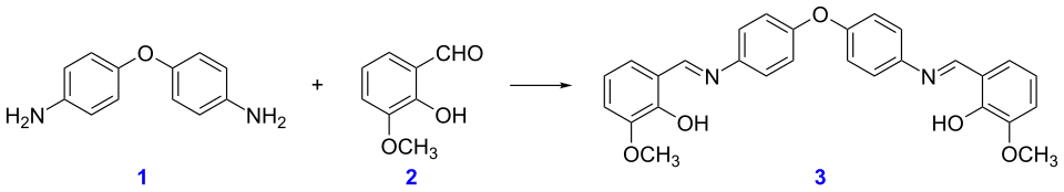 Bases de Schiff podem ser sintetizadas a partir de uma amina aromática e de um composto carbonila por adição nucleofílica formando um hemiaminal, seguido por uma desidratação para gerar uma imina. Um reação típica é a de éter 4,4'-diaminodifenílico com o-vanilina:[3]