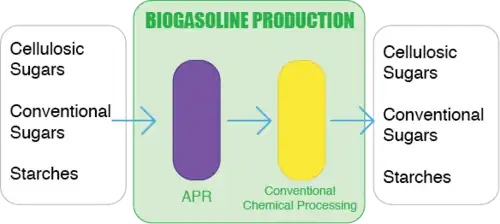 Açúcares são convertidos diretamente em biogasolina. No final de Março de 2010, a primeira fábrica de demonstração de biogasolina do mundo foi criada em Madison, EUA pela Virent Energy Systems, Inc.[5] A Virent descobriu e desenvolveu uma técnica de reforma de fase aquosa (APR) [6] em 2001. A APR inclui muitos processos, incluindo reforma catalítica para gerar hidrogênio, desidrogenação de álcoois / hidrogenação de carbonilos, reações de desoxigenação, hidrogenólise e ciclização. A iniciadora da APR é uma solução de hidrato de carbono produzida a partir de matéria vegetal, e o produto é uma mistura de produtos químicos e hidrocarbonetos oxigenados. A partir daí, os materiais passam por processamento adicional químico convencional para produzir o resultado final: uma mistura de hidrocarbonetos não oxigenados que teria um custo favorável. Estes hidrocarbonetos são exatamente os mesmos encontrados em combustíveis derivados do petróleo e, por isso os carros atuais não precisariam de adaptações para rodar com biogasolina. A única diferença é a origem. Combustíveis à base de petróleo são feitos a partir de óleo e biogasolina é feita a partir de plantas como beterraba, cana-de-açúcar ou biomassa celulósica, que normalmente seriam resíduos vegetais.[7]