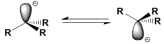 A energia de inversão do carbânion é fortemente dependente dos substituintes. Para R = H a barreira é de apenas 2Kcal/mol, enquanto que se R = F a barreira é de 120Kcal/mol - levando o carbânion a possuir um par de enântiomeros[7].