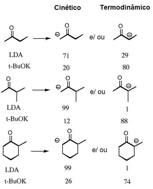 Entretanto, esse comportamento depende de fatores como a temperatura e a base utilizada. Em geral, maiores temperaturas levam a produtos termodinâmicos já que, com maior energia disponível no sistema, é possível estabelecer rapidamente os equilíbrios que levarão aos produtos menos energéticos.