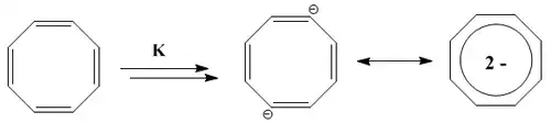 O ciclooctatetraeno possui capacidade semelhante, mas são necessárias quatro pares de elétrons extras. Assim, a reação de ciclooctatetraeno com dois equivalentes de potássio metálico também leva ao produto aromático: