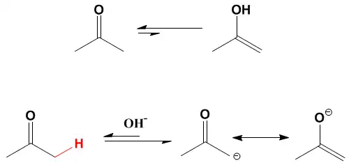 O hidrogênio α-cetona possui elevada acidez relativa, devido a estabilização por ressonância, gerando enol em equilíbrio com a cetona. Essa característica pode ser aproveitada sinteticamente, utilizando bases fortes para abstrair o hidrogênio α-cetona e provocar a formação do enolato - que é um híbrido de ressonância em que há contribuição do carbânion de cetona.