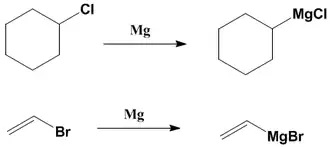 A Reação de Grignard é a principal forma de obter organometálicos de metais alcalino-terrosos. A reação consiste em reagir um haleto com ao menos um equivalente de magnésio metálico em éter ou THF seco, obtendo a ligação carbono-magnésio. Pode ser obtida para cloretos, brometos e iodetos, mas fluoretos não reagem.