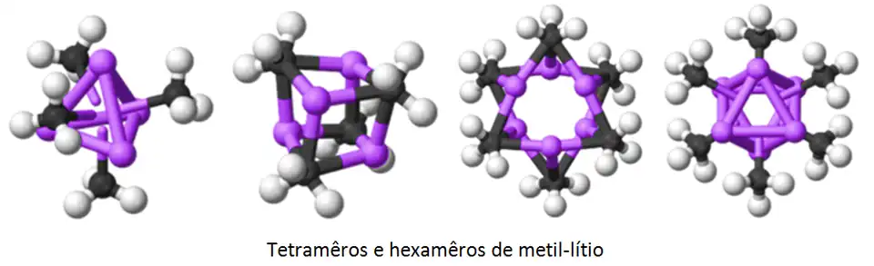 Os reagentes organolítios tendem a existir sob a forma de tetrâmeros ou hexâmeros devido à natureza covalente da ligação carbono-lítio. Os compostos organolítios, como o metil-lítio, costumam ser bons nucleófilos e bases fortes[3],[4].