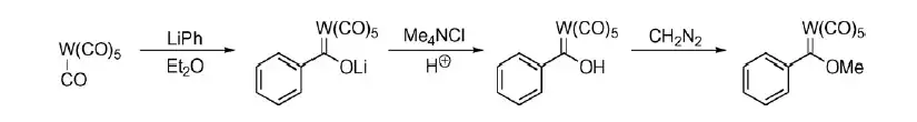 Durante os anos 1960, Fischer e Öfele estavam trabalhando em complexos alceno-metal-carbonilo (Mn, Re). Em 1964, enquanto carbenos estavam em voga na química orgânica, Fischer relatou e caracterizou de forma inequívoca o primeiro complexo de metal-carbene: o pentacarbonil metoxifenilmetileno de tungstênio (0). Os autores estenderam a síntese para os complexos de cromo (0), de ferro (0) e de manganês (0) com diferentes grupos alcóxi e alquila.[18]