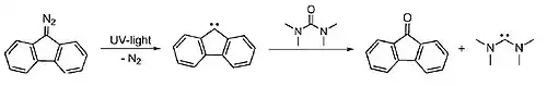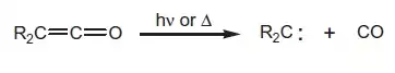 No caso da decomposição de diazometano a cetenos, em que o metileno é o produto principal, ela rapidamente vai ao estado trivalente. A reação fotoquímica é realizada em recipiente de quartzo e a pressão muito baixa. O diazometano necessário para a reação térmica pode ser obtido por uma vaeriedade de métodos , dentre os qual o mais conveniente é a reação do hidroclorato de metilamina com a ureia. A reação com ácido nitroso, a metilureia é transformada em nitrosometilureia, cuja ação com hidróxido de potássio forma diazometano.