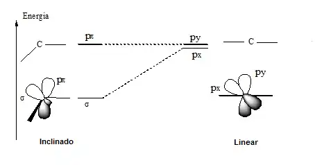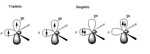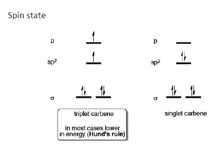 Os carbenos possuem um par de elétrons não ligantes que pode apresentar spin emparelhados na forma do estado singleto, e spins desemparelhados na forma do estado tripleto. O carbono do carbeno esta ligado a dois grupos adjacentes. O orbital p é perpendicular ao plano definido pelos três átomos da estrutura do carbeno, e o orbital σ está paralelo a esse plano. A multiplicidade do estado fundamental dos carbenos irá variar de acordo com a estrutura, em razão da maioria dos carbenos não serem lineares. Um carbeno com geometria linear possui orbitais não ligantes degenerados com centro sp-hibridizado. A quebra de degenerescência é causada pela inclinação da molécula induzindo o átomo de carbono adquirir uma hibridização do tipo sp2, sendo chamado de pπ, pelo fato do orbital px permanecer inalterado.[9]