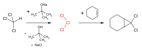 Uma maneira clássica de formar ciclopropanos é através da reação de um cicloalqueno com diclorocarbeno. A formação do ciclopropano a partir de alceno ocorre por um mecanismo concertado que é possível para carbenos singleto, o que tem consequências na estereoquímica da reação, sendo uma reação estereoespecífica.