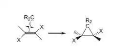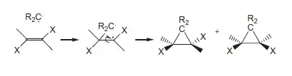 Os carbenos tripletos assim como os diradicais adicionam-se a alcenos em duas etapas: um novo intermediário diradical é formado para dar , após o fechamento do anel, como produto dois diastereoisômeros.