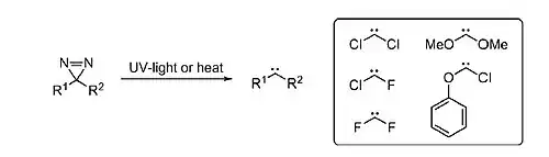 A preparação de carbenos pela decomposição térmica de hidrocarbonetos, mostra que carbonos trivalentes são produzidos primariamente.O metileno foi o primeiro composto dos carbenos, e foi preparado termicamente pela decomposição do diazometano.[16]