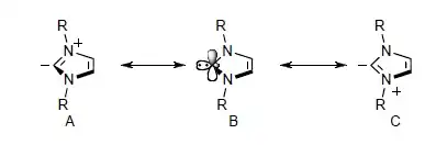 Os NHCs são diaminocarbenos e formam complexos tipo Fisher com metais de transição. Desde os trabalhos iniciais de Wanzlick em 1960 para investigar a reatividade e estabilidade de carbenos NHCs. POuco tempo depois Wanzlick reportou as primeiras aplicações de NHCs como ligantes para complexos metálicos. Os carbenos NHCs são estabilizados eletronicamente e estericamente e diferentes dos carbenos, são eletronicamente ricos pelo efeito de ressonância.[19]