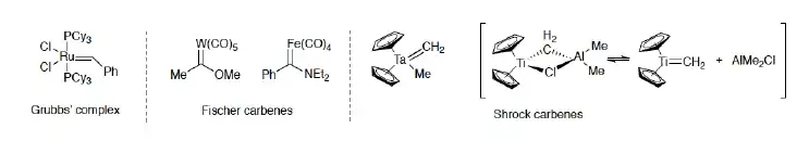 Um complexo carbeno metal de transição é um composto organometálico apresentando um ligante orgânico divalente. Os complexos de carbenos são conhecidos em uma ampla faixa de diferente reatividades e diversos substituintes. Os Carbenos de Fisher nomeados mais tarde por Ernst Otto Fisher apresentam fortes receptores π ao metal e são eletrofílicos no átomo de carbono do carbeno. Os Carbenos de Schrock nomeados mais tarde por Richard R. Schrock, são caracterizados pela maior nucleofilicidade dos carbonos centrais nos carbenos onde estas espécies apresentam tipicamente metais de alta valência.