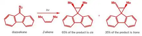 Embora carbenos formados termicamente a partir de diazoalquenos sejam carbenos singletos, em condições de indução fotoquímica ocorre a transformação no tripleto mais estável. Pode ocorrer a formação de uma mistura de isômeros. Exemplo de adição não-estereoespecífica: