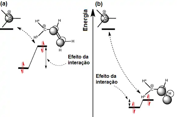 A conformação desempenha um papel importante, e às vezes ela pode ser usado para mudar a deslocalização afastada (ligação desconjugada), e avaliar seus efeitos por diferença com a conformação conjugada. A conjugação envolve uma interação entre os orbitais π e supostamente implica uma grande energia de estabilização (ou ressonância energética) e o efeito se estende por várias ligações. No caso do carbocátion, a deslocalização da carga corresponde à interação entre o orbital π vazio do centro da carbocátion, e, pelo menos, um orbital π cheio expandido em átomos vizinhos (Figura 5a).[14] Analisando um cátion alílico como um sistema modelo para avaliar essa estabilização, verifica-se na Figura 5b o efeito da hiperconjugação envolvendo orbitais CH cheios, que são, em princípio, inferior em energia. Desta forma, o efeito é em princípio maior para a conjugação do que para hiperconjugação.