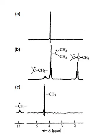 No final da década de 1950, George A. Olah observou pela primeira vez cátions alquila. Em 1962 Olah, então na Dow Química, relatou uma experiência em que o cátion terc-butila era formado, a partir da reação de fluoreto de terc-butila com pentafluoreto de antimônio, e permanecia em solução por longos períodos de tempo, permitindo um estudo detalhado da sua estrutura através de técnicas espectroscópicas como a ressonância magnética nuclear (RMN), Figura 3, e infravermelho. Na década de 1960 a utilização dos chamados superácidos passou a representar uma alternativa promissora para a obtenção de estabilidade de cátions alquila e carbocátions, possibilitando sua utilização em superfícies sólidas e zeólitas. Entre 1968-1970, DeMember e Commeyras, utilizando as técnicas de Infravermelho e Raman, conseguiram comprovar a estrutura planar do carbocátion.[9]