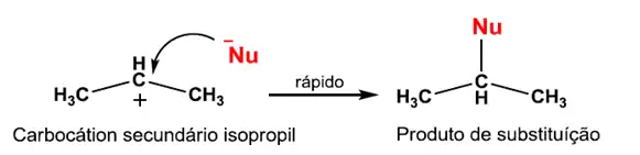 Interação com nucleófilo: O carbocátion ao se formar pode interagir com espécies negativas (nucleófilo) do meio reacional.