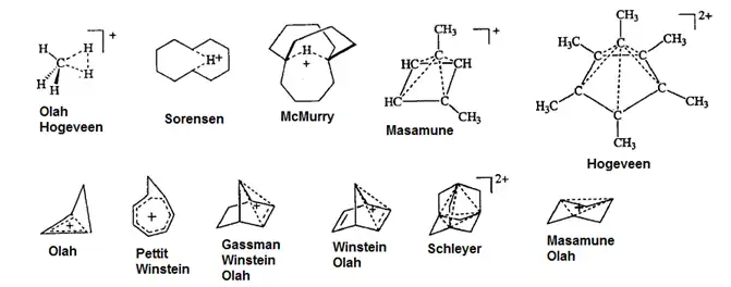 Vários estudos foram realizados ao longo das décadas sobre diferentes carbocátions não-clássicos, envolvendo reações solvolíticas e a estabilidade de íons em meios superácidos. Estes estudos mostraram que a hipercoordenação do carbono é um fenômeno geral de sistemas hidrocarbônicos com deficiência de elétrons. Os principais íons estudados e seus pesquisadores são apresentados abaixo: