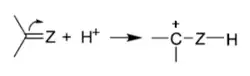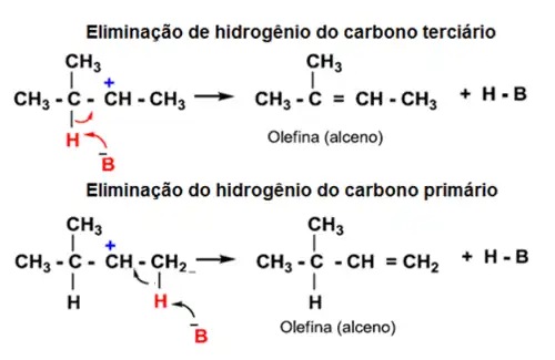Eliminação de próton: O carbocátion na presença de uma base forte elimina um próton e forma olefina (alceno). No processo de eliminação de próton é comum se aplicar à regra de Saytzeff (formará em maior proporção o alqueno que possuir o maior número de substituintes alquila conectado no carbono sp2).
