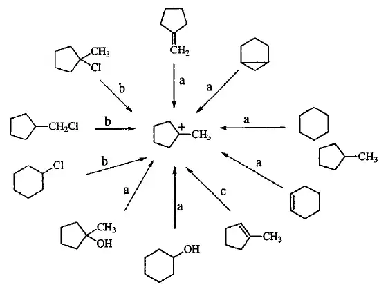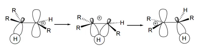 - Reações de transposição ou rearranjo: normalmente gerada pela migração de um grupo alquila, arila ou H. Essas reações exigem a co-planaridade entre o orbital p do cátion e o orbital σ do grupo que migra. A capacidade migratória segue a ordem: grupo arila > grupo alquila ramificado > grupo alquila. Outro tipo de reação de transposição envolvendo carbocátions são: transposição pinacolínica, reação de Tiffeneau-Demjanof e rearranjo de Favorskii.