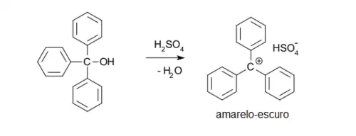O cátion trifenilmetil foi o primeiro carbocátion estável reportado. Em 1899, Stieglitz abordou a possibilidade de compostos de hidrocarbonetos iônicos.[4] Em 1901 Norris, Kehrman e Wentzel [5][6] descobriram que o álcool incolor trifenilmetil gerava soluções amarelo-escuro em ácido sulfúrico concentrado, Figura 2, e de forma semelhante o cloreto de trifenilmetil formava complexos de cor alaranjada na presença de alumínio e estanho. Já em 1902 Adolf von Baeyer sugeriu uma correlação entre o aparecimento da cor e a formação do sal.[7]