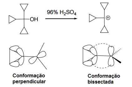 Cátions ciclopropilmetil: São mais estáveis que os cátions benzila. Podem ser preparados pela solução do álcool correspondente em ácido sulfúrico. A maior estabilização está relacionada à preferência da conformação bissectada do cátion ciclopropilmetil em comparação a conformação perpendicular. Desta forma, ocorre um alinhamento dos orbitais da ligação C-C do ciclopropil para efetiva sobreposição dos orbitais.